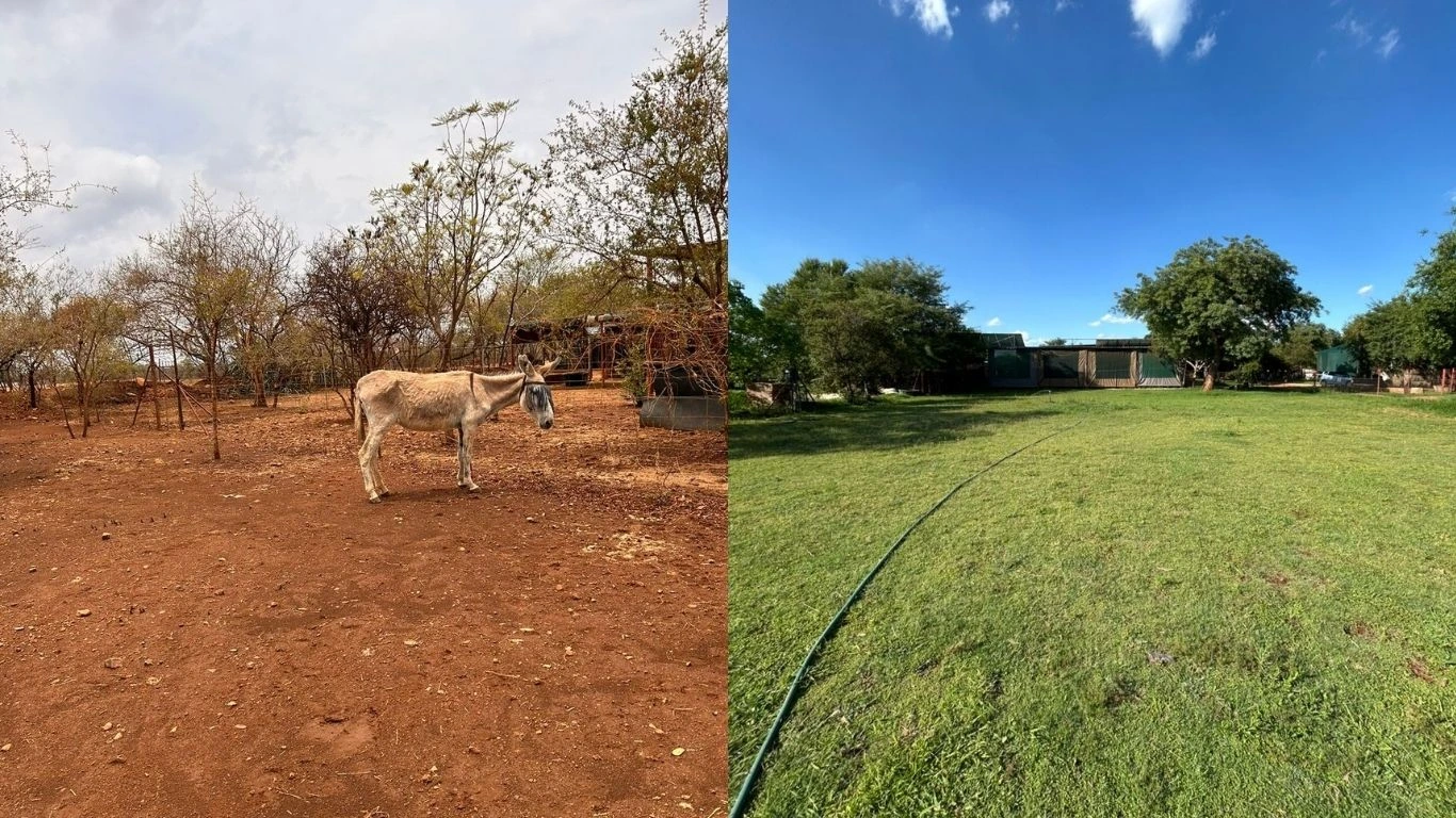 (Left) Before the first solar pump was installed at MARES. (Right) With regular watering, parts of the grounds have returned to a lush green, providing food for hundreds of donkeys. Credit: MARES